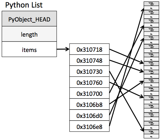Instead of each box storing the actual value, they store the PyObject, which in turn stores a pointer or reference to the actual data, which will be stored elsewhere:
